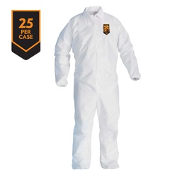• • KleenGuard* chemical chemical chemical A40 liquid and particle protection coveralls are made of microporous film laminate with a zipper front and elastic wrists and ankles