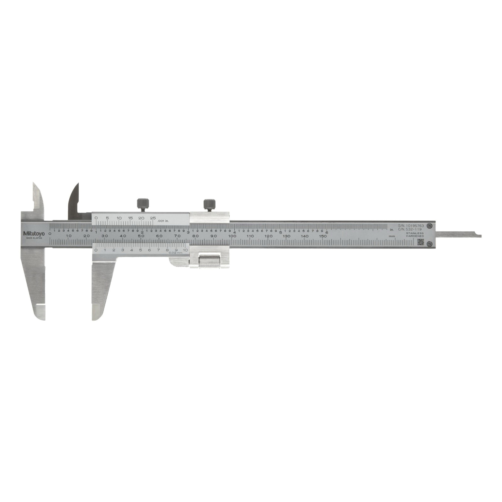 Mitutoyo 532-119 Vernier Caliper With Fine Adjustment, 0 to 5 in Measuring, Graduations 0.02 mm, 0.001 in, 40/21.5 mm D Jaw, Stainless Steel, Satin Chrome