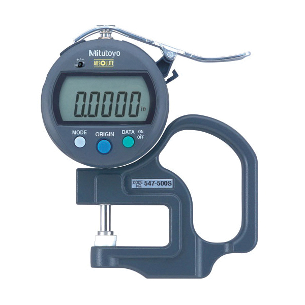Mitutoyo 547-500S Imperial/Metric Flat Anvil Digital Thickness Gage, 0 to 0.47 in Measuring, 0.248 in Dia Flat Contact, 30 mm D Throat, Ceramic Spindle and Anvil