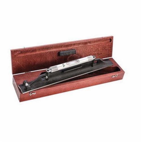 • The base of the levels features a groove running the length of the base, which provides a reliable seat for round work such as pipes or shafting• Cross test vial enables simultaneous leveling in two directions• The vials are adjustable to a positive setting and are housed in a satin finished brass tube with a friction-fit closing cover to prevent breakage• Main level vials have graduations that are approximately 80-90 seconds or 0.005 in per foot (0.42 mm per meter)• Cast iron base for durability and finished wood case for storage• There are five, six, or seven lines on each side of the bubble, depending on the base length• Unmilled surface• Brass frame material• V-shaped groove along the base provides reliable seating when leveling round items• Precision machined on the reference surface• With the cross test vial, it is possible to simultaneously level in both directions• This prevents inaccuracies in the main vial reading caused by canting the level sidewise on round work